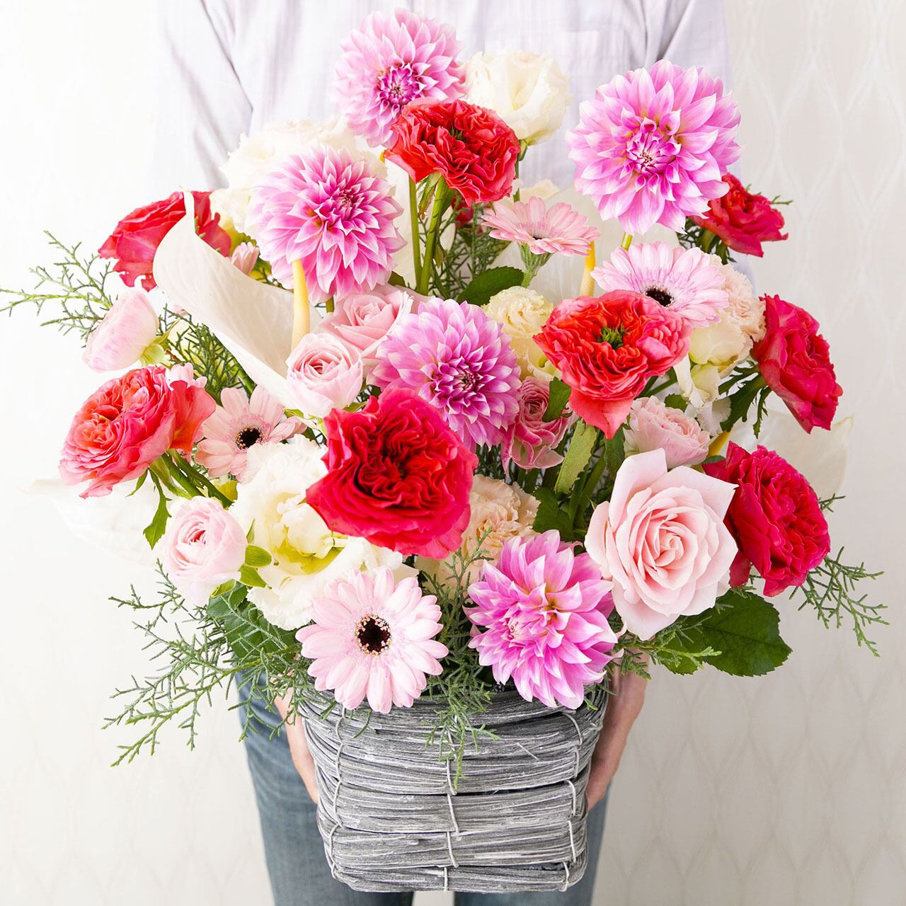 贈る季節に出回っている可愛らしいお花や色味を選んでボリュームたっぷりにアレンジします
