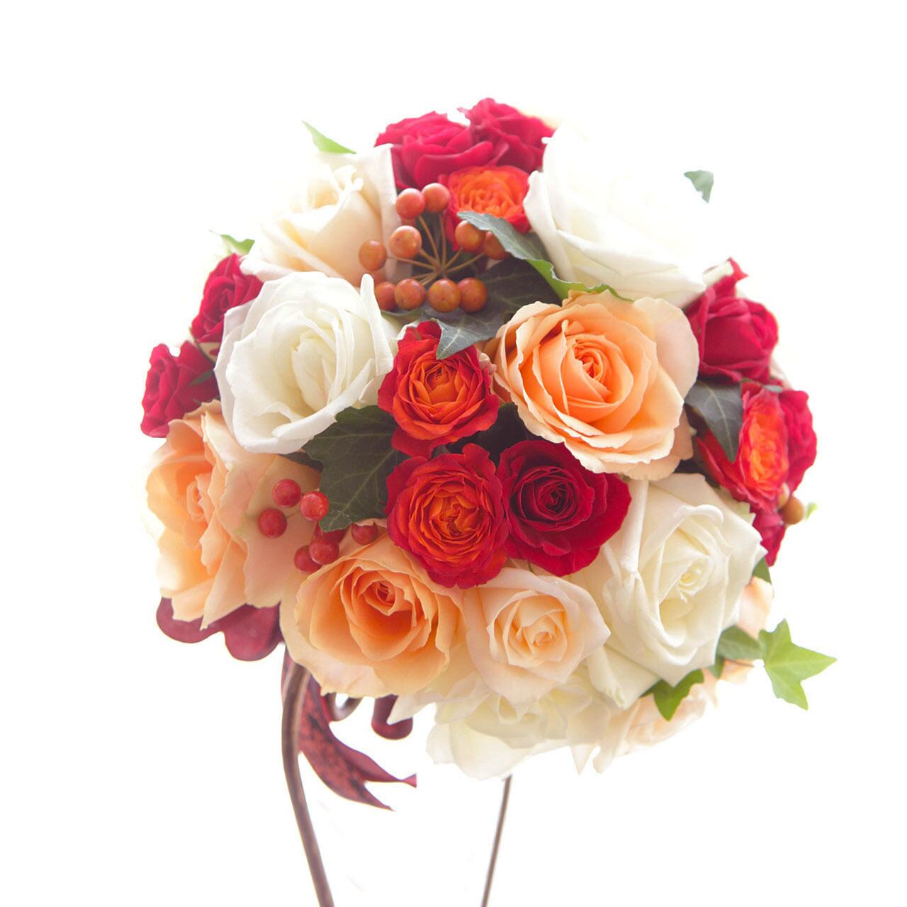相性の良い組み合わせの赤とオレンジを引き立たせた美しい色合いのラウンドブーケです